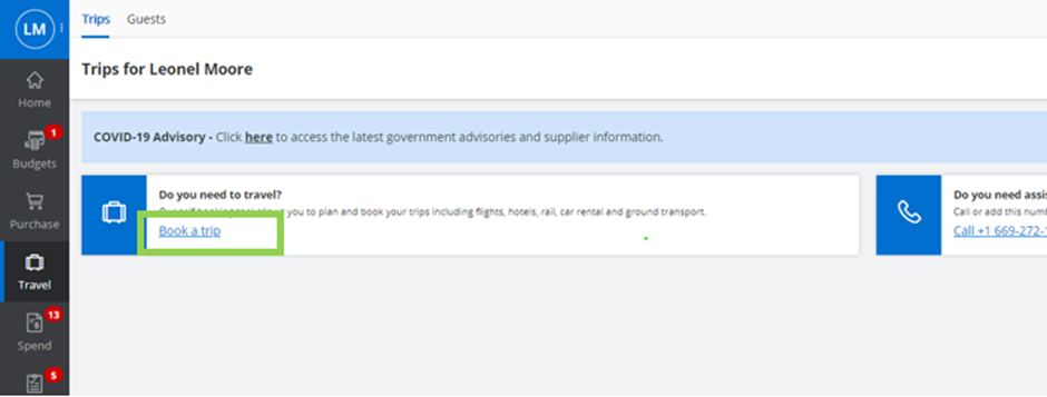 Step 1: Log in to the platform and select Travel from the horizontal navigation menu.