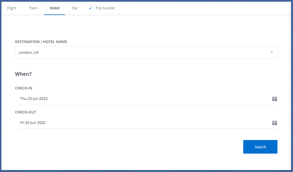 Step 3: Choose your Travel Type (Hotel) and input your search parameters (Location or Hotel name and the check-in and check-out date).