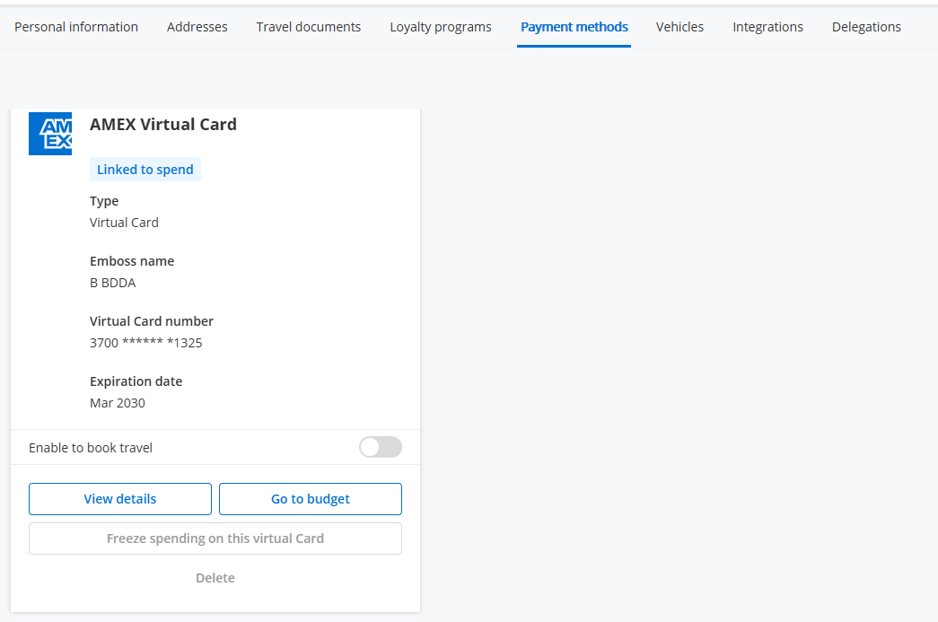 The user will see this shared company card in their own profile under payment methods. It will appear as a credit card but will be read only, with only the first 4 and last 4 digits of the card number visible: