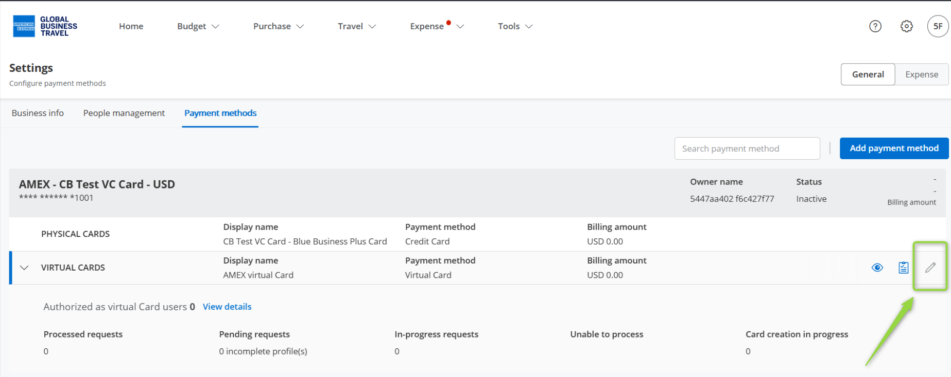 Tip: You can manage changes to this card by clicking the pencil "edit" icon next to the card.How to manage user access to your company level payment method