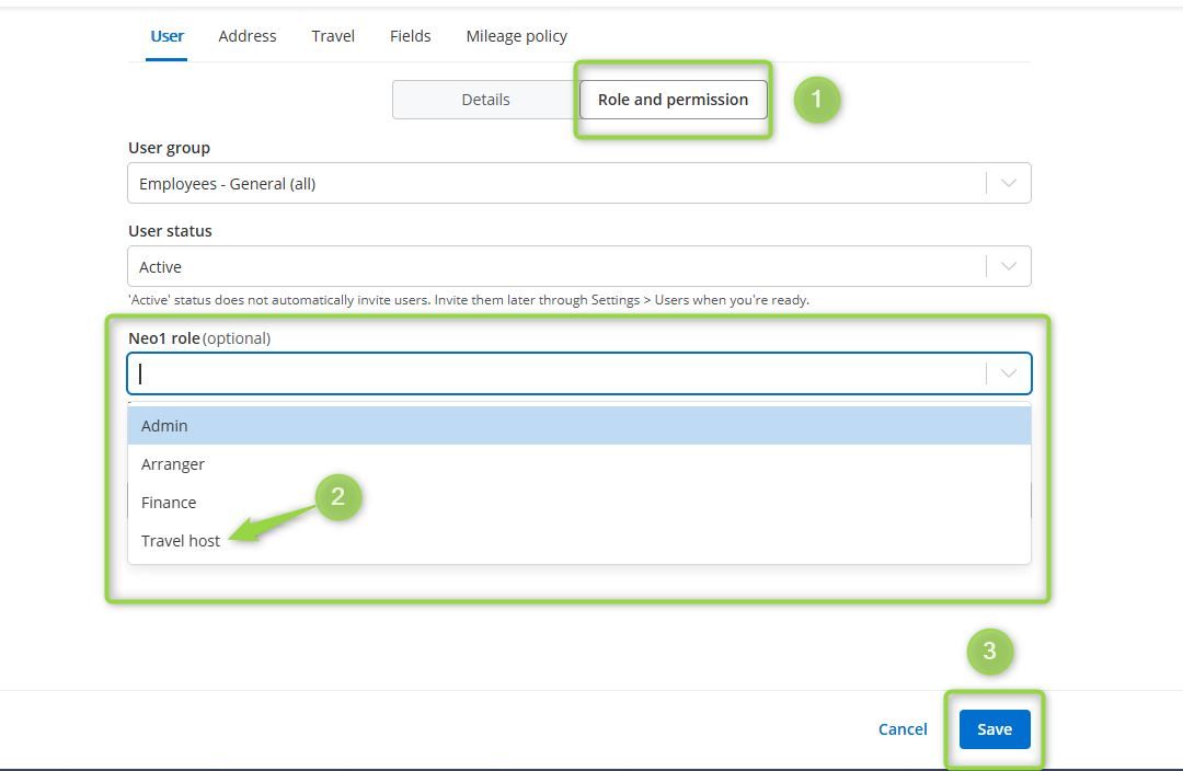 Step 3: Click the Role and permission tab. Under Role select Travel host. Once updated, click Save.