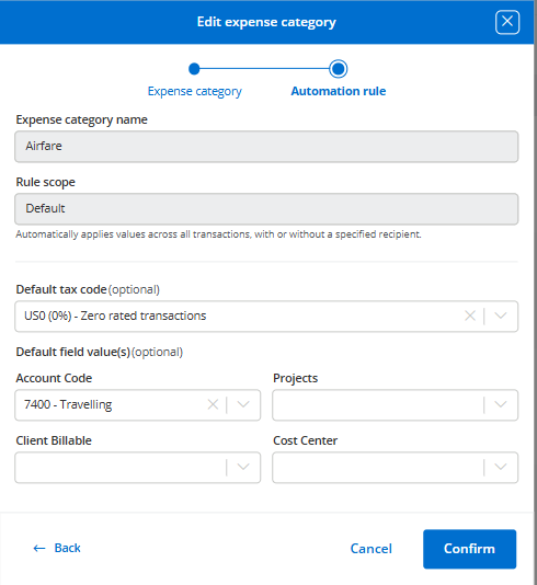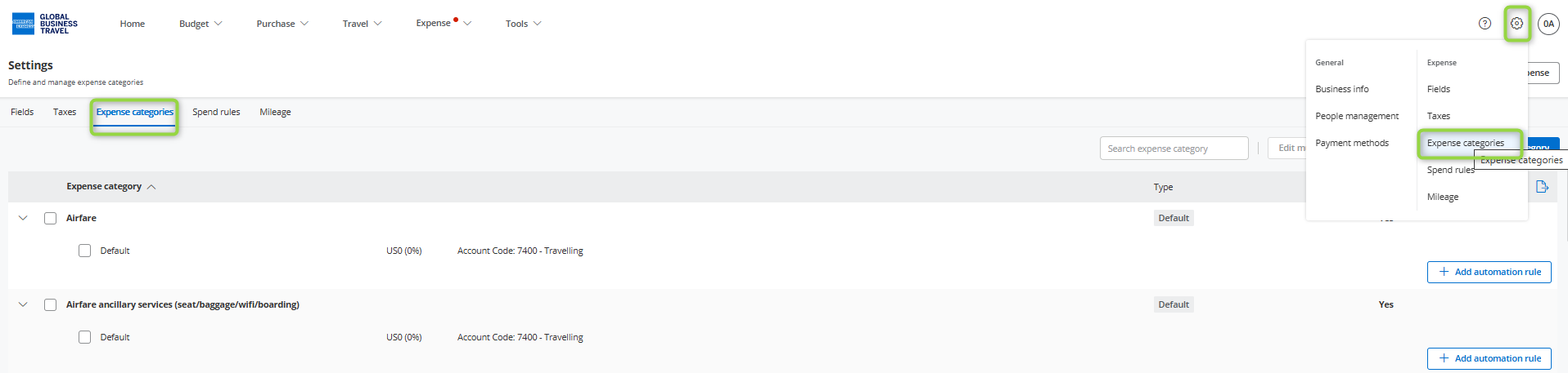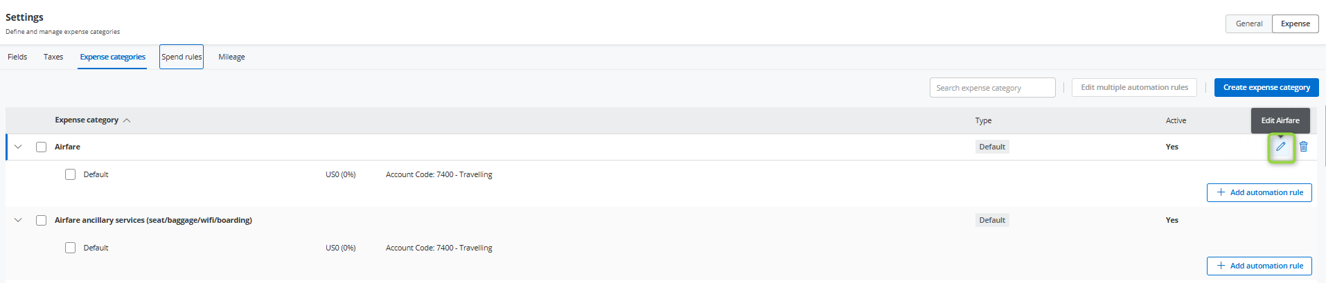 This will open the expense category settings window for you to manage the default expense category settings and the automation rule.
