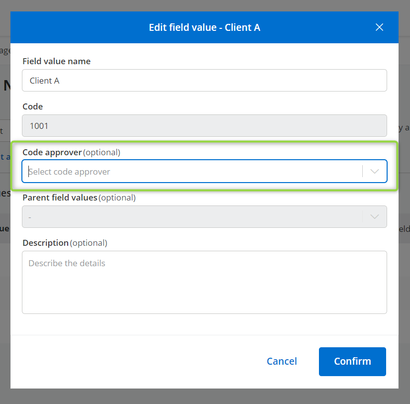 Within that set-up process, you will then be tasked with creating your field codes, and a code approver can be assigned at that time.