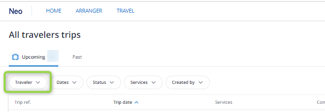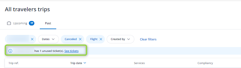 Step 3: Click traveler in the top-left filters to search for and select the traveler whom you are expecting a credit (you can use the additional filters like trip status, date and service to narrow down the trip list and aid in your investigation).